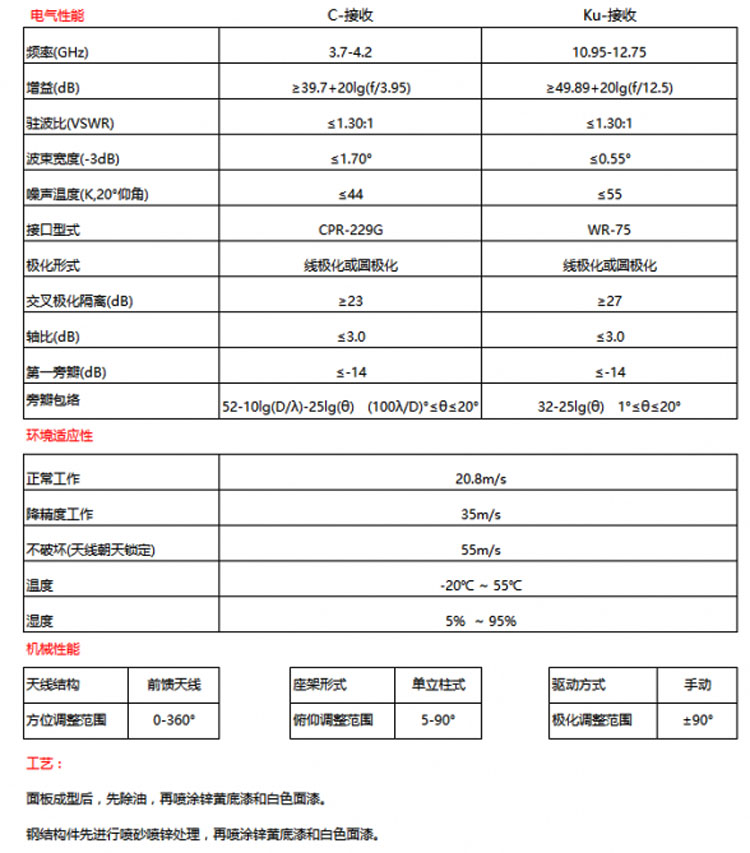 3.0米前饋手動接收天線,其拋物反射麵由8片鋁板拉伸(shēn)成型的反射麵組成,除油後先塗覆防鏽鋅黃底漆,再塗覆白(bái)色麵漆,所有鋼結構件先除鏽噴砂噴鋅處理後再塗底漆和(hé)白色麵漆,保證持久耐用。...